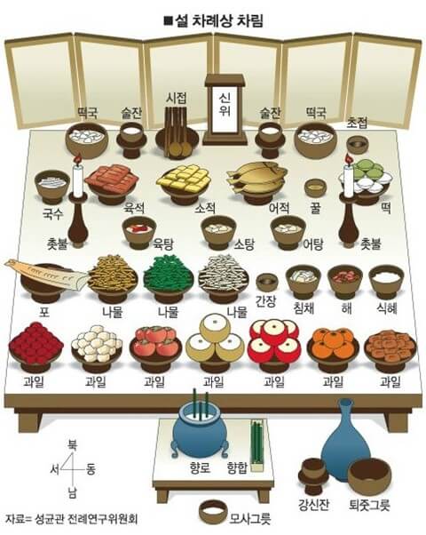 - 홍동백서: 붉은 과일은 동쪽, 흰 과일은 서쪽에 놓습니다.
