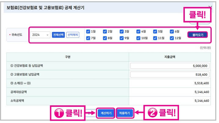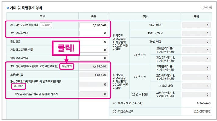 → 건강보험료 및 고용보험료는 건강보험료 항목에 있는 [계산하기] 버튼을 통해 입력