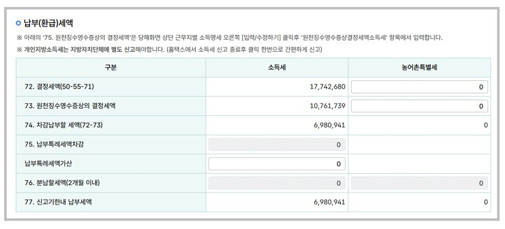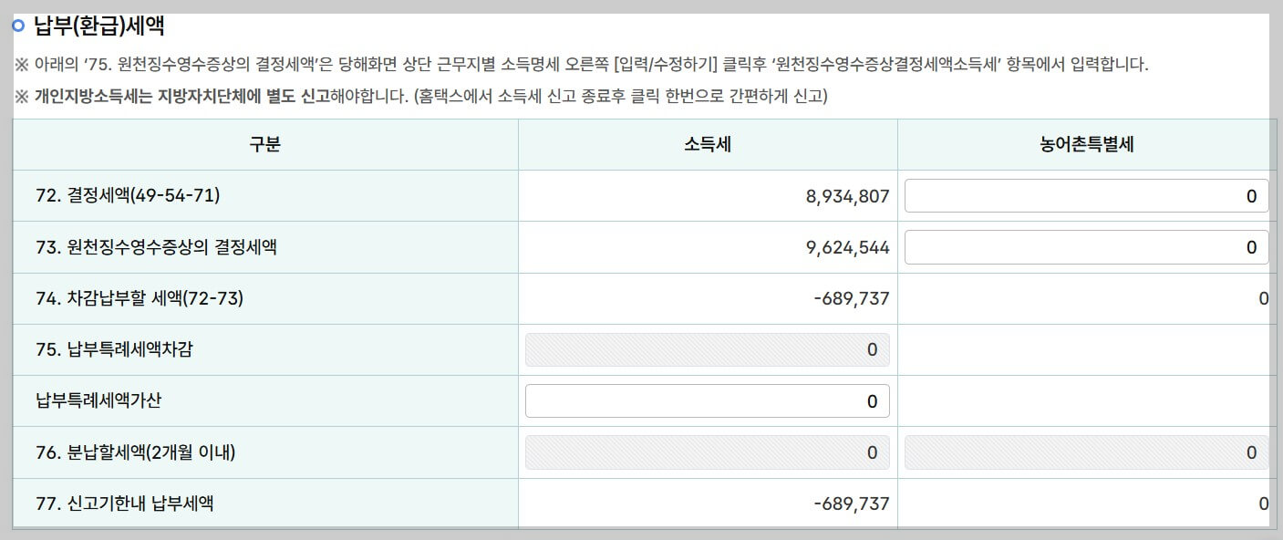 → 세액감면과 세액공제에 대한 입력이 완료되면 화면 아래에 납부세액 또는 환급세액이 자동 계산되어 나타남