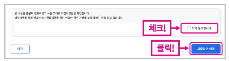 → 수정할 내용이 없으면 '이에 동의합니다'에 체크하고 [제출화면 이동] 버튼을 클릭