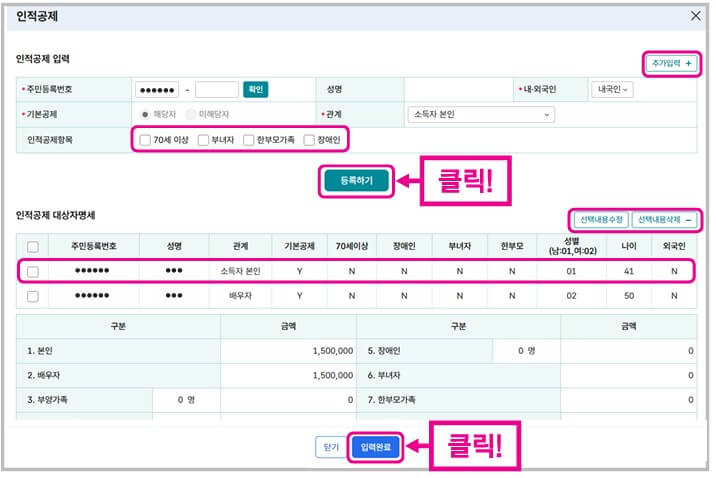 → 아래 계산된 인적공제 금액을 확인하고 [입력완료] 버튼을 클릭하면 인적공제 팝업창이 사라지고 근로소득 신고서 인적공제 명세에 입력한 금액이 보임