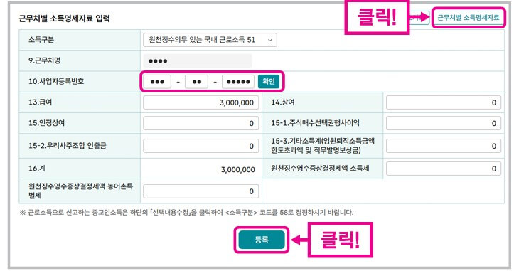 → 팝업창에 원청징수의무자가 제출한 근로소득 지급명세서가 보여짐