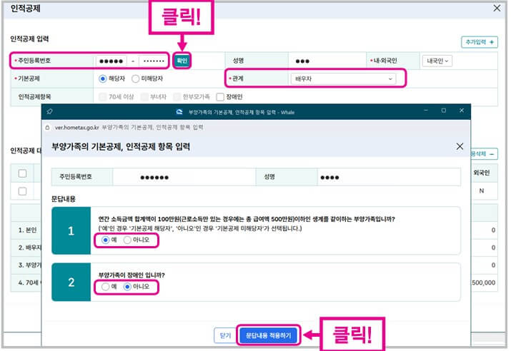 → 질문에 예/아니오를 선택하면 기본공제 및 인적공제항목에 해당 여부가 자동 입력되며, 추가로 선택할 인적공제 항목이 있는 경우 체크