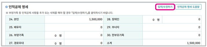 → 인적공제 명세 항목 우측에 [입력/수정하기] 버튼을 클릭하면 [인적공제] 화면이 팝업창으로 뜨고 인적공제 대상자를 추가하거나 삭제할 수 있음