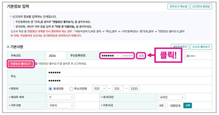 → [주민등록번호] 항목에 [조회] 버튼을 클릭하면 납세자 기본정보가 나타남