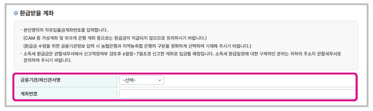 ※ 환급세액이 발생한 경우 환급받을 계좌 란에 금융기관명과 계좌번호를 입력