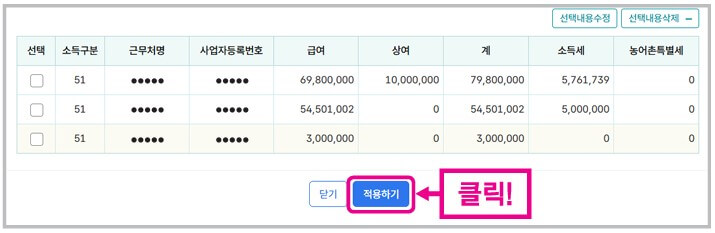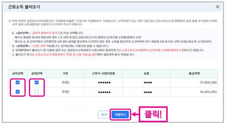 → 급여선택 항목은 급여가 중복되거나 누락되지 않게 선택하시고, 공제선택 항목은 소득공제 등을 적용하고자 하는 근무지 한 곳만 → 을 선택한 후 [적용하기]를 클릭합니다.