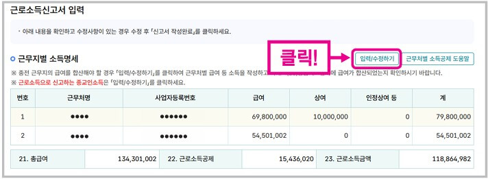 → 추가로 입력할 근로소득 내역이 있는 경우 우측 상단에 [입력/수정하기] 버튼을 클릭하면 [근무처별 소득명세] 팝업창이 뜸