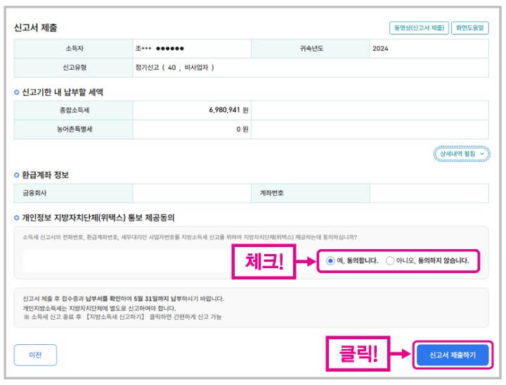 → 종합소득세 신고와 별도로 지방소득세를 신고하여야 하며, [개인정보 지방자치단체(위택스) 통보 제공동의]에 동의하시면 보다 편리하게 신고 가능