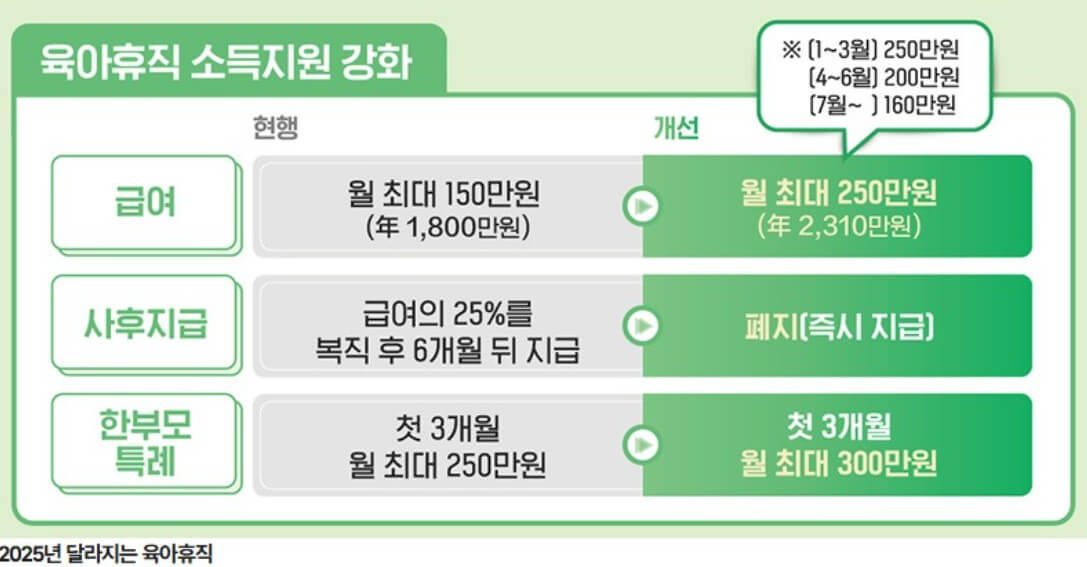 - 월 상한액= 육아휴직 개시일 기준 통상임금의 100% (월 상한액 250~450만원)
