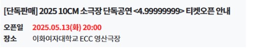 2025년 6월, 십센치(10CM)가 선보이는 단독 소극장 공연 <4.99999999>는 그동안의 정규 시리즈를 넘어서는 새로운 시도로, 보다 진솔하고 깊이 있는 음악적 교감을 예고합니다.